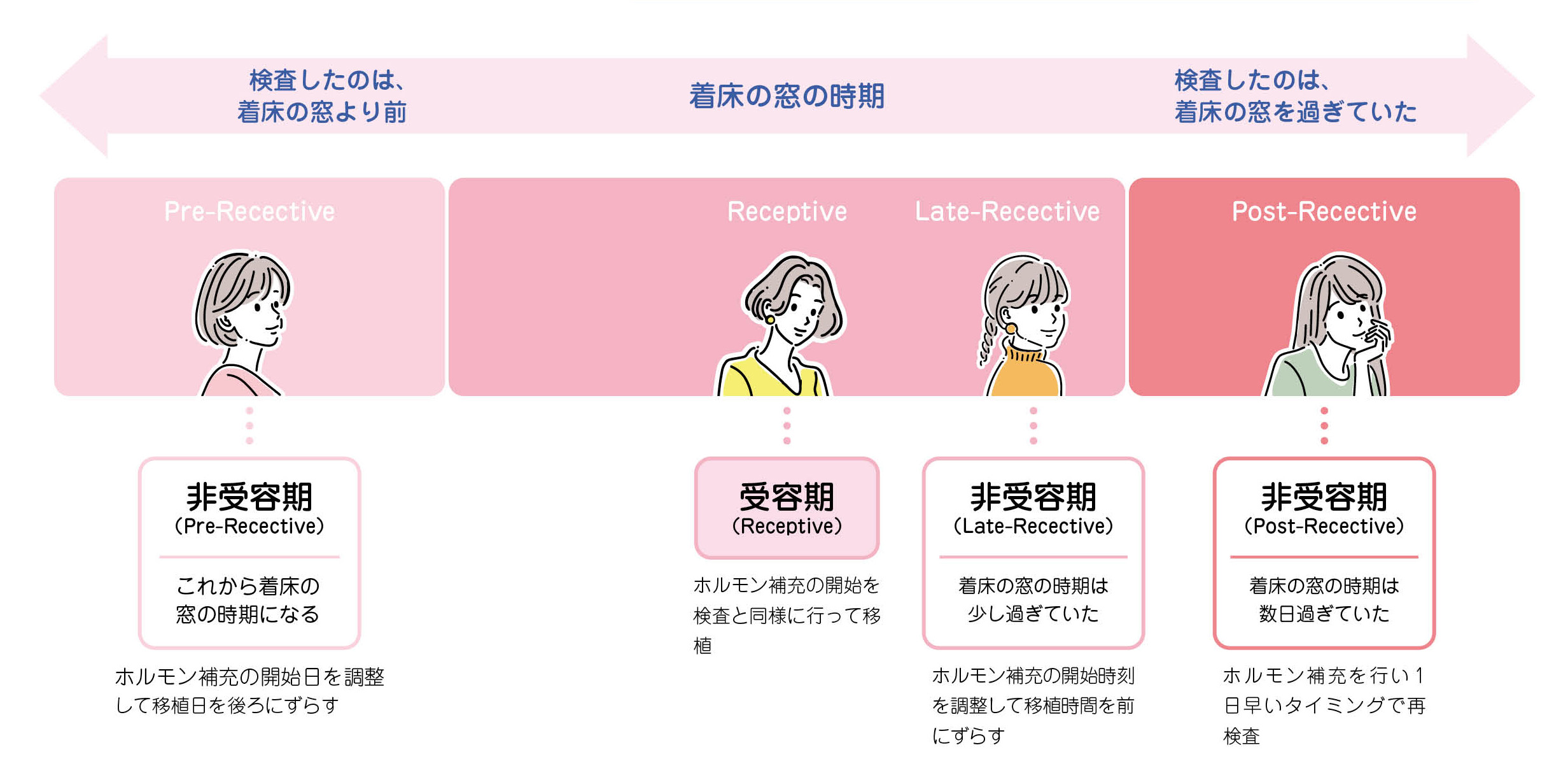 ホルモン補充周期で胚移植を行う時と、方法は同じです。まず子宮内膜を厚くするようホルモンの投与を行い、その後、プロゲステロンの投与開始から5日後に内膜を採取します。採取した細胞組織を解析して、内膜が「受容期」か「非受容期」かを評価します。