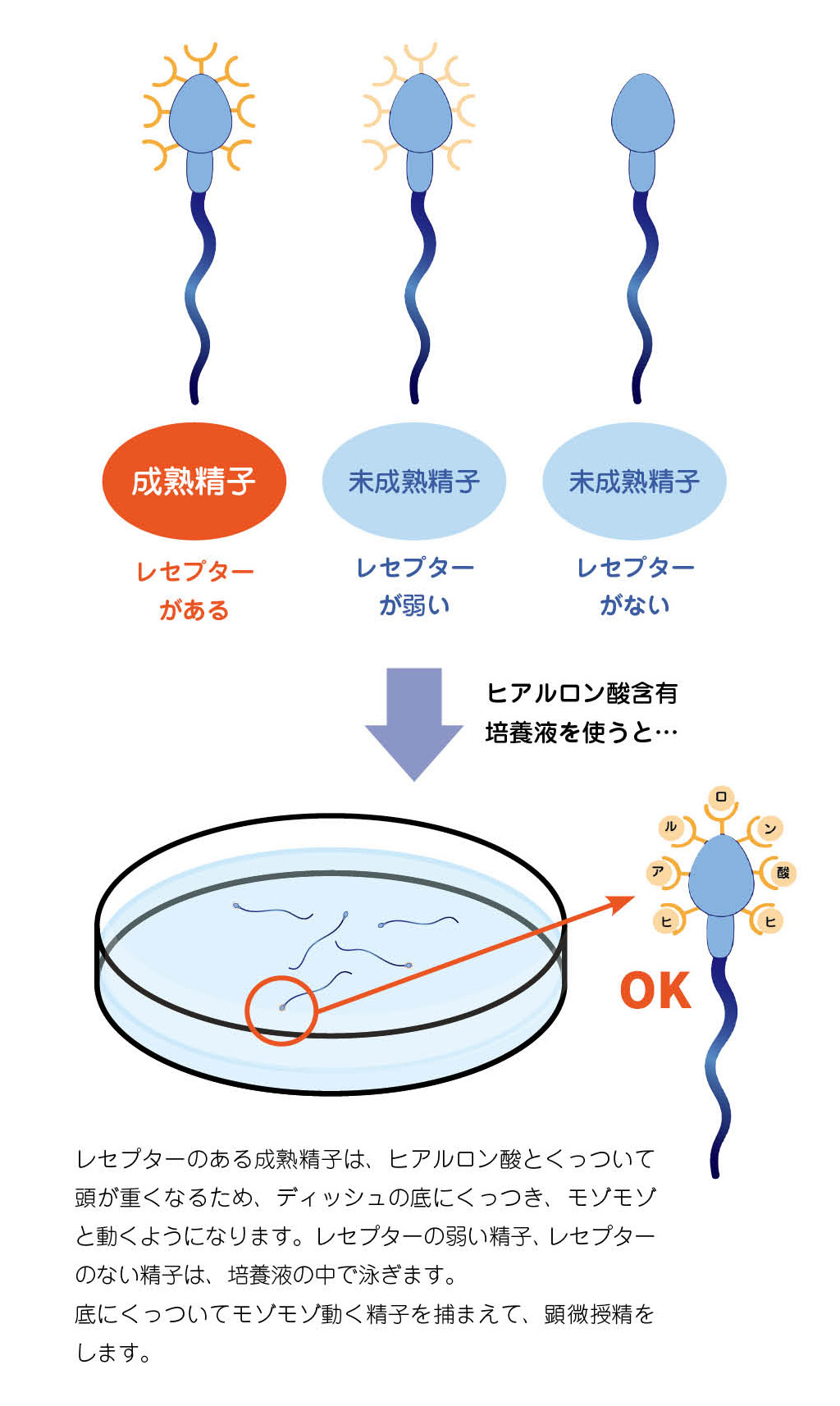 成熟精子にはヒアルロン酸とくっつくことができるレセプターが発現します。運動性のある精子でも、ヒアルロン酸レセプターが弱いもの、レセプターがないもの(未成熟精子)があり、これらはDNAに傷がある可能性があります。そのため、PICSIを行うことで、、成熟精子を選べると考えられています。