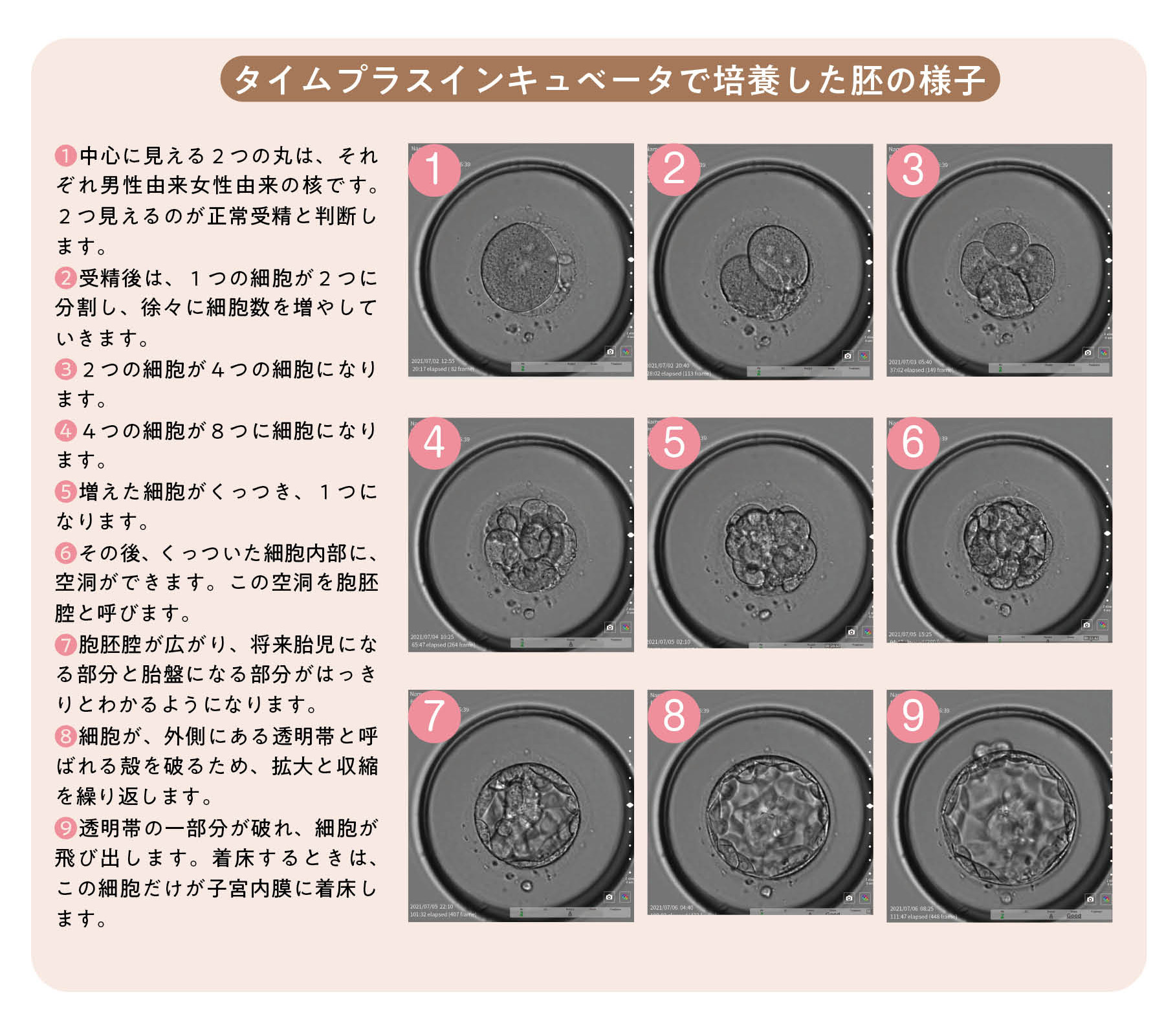 インキュベーターは、光や温度、気相(酸素、窒素、二酸化炭素の割合)や湿度などの条件を女性の体内環境に模したもので、そこから体外に出すことは、胚にとってストレスとなります。ですから、インキュベーターから取り出して受精や胚の成長を確認したり、培養液を変える(培養方法による)ことは、胚に少なからず負荷を与えます。