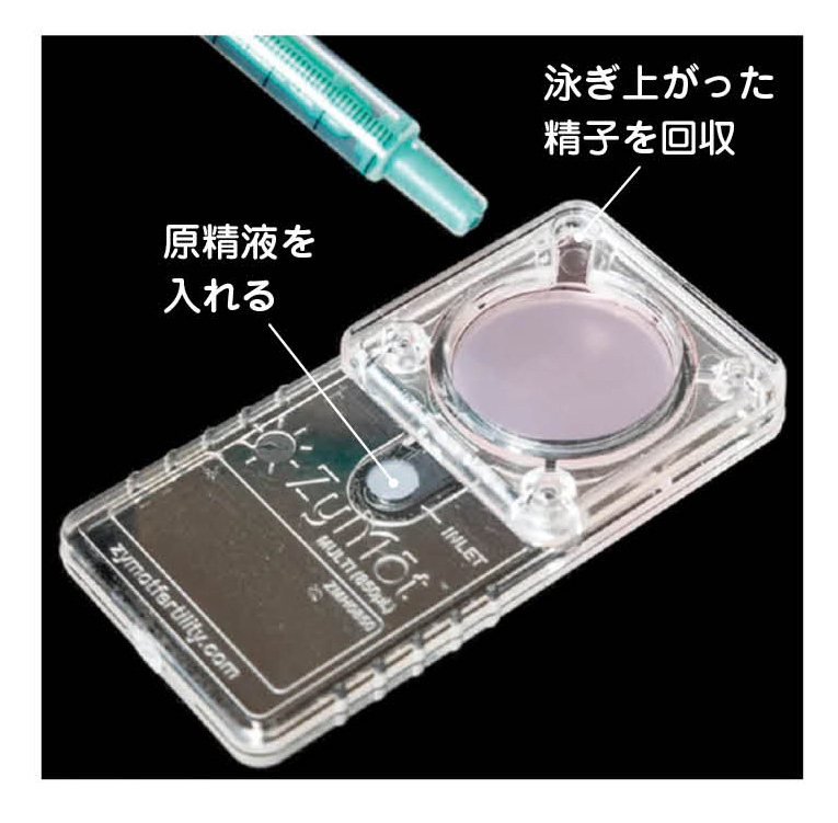 マイクロ流体技術を用いた精子選別とは、正常な精子の頭部がギリギリ通れる大きさの膜(フィルター)が貼られた小さな専用デバイスを用いて、DNAの傷が少ないとされる精子を回収する方法です。このデバイスの中を泳いで、自力で膜の上に上がってきた良好精子を選別して、顕微授精に臨みます。この技術には、ザイモート(ZyMōt)やスイムカウントハーベスター(SwimCount™Harvester)などがあります。