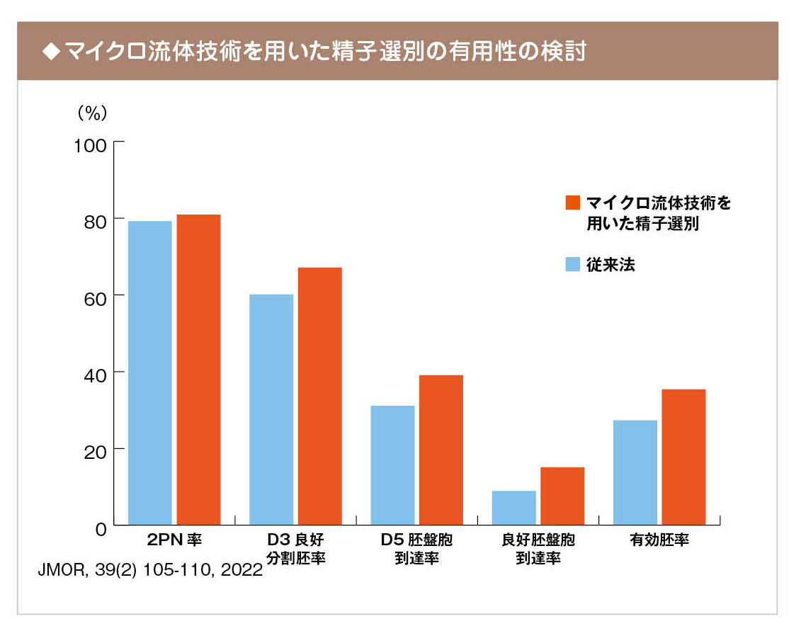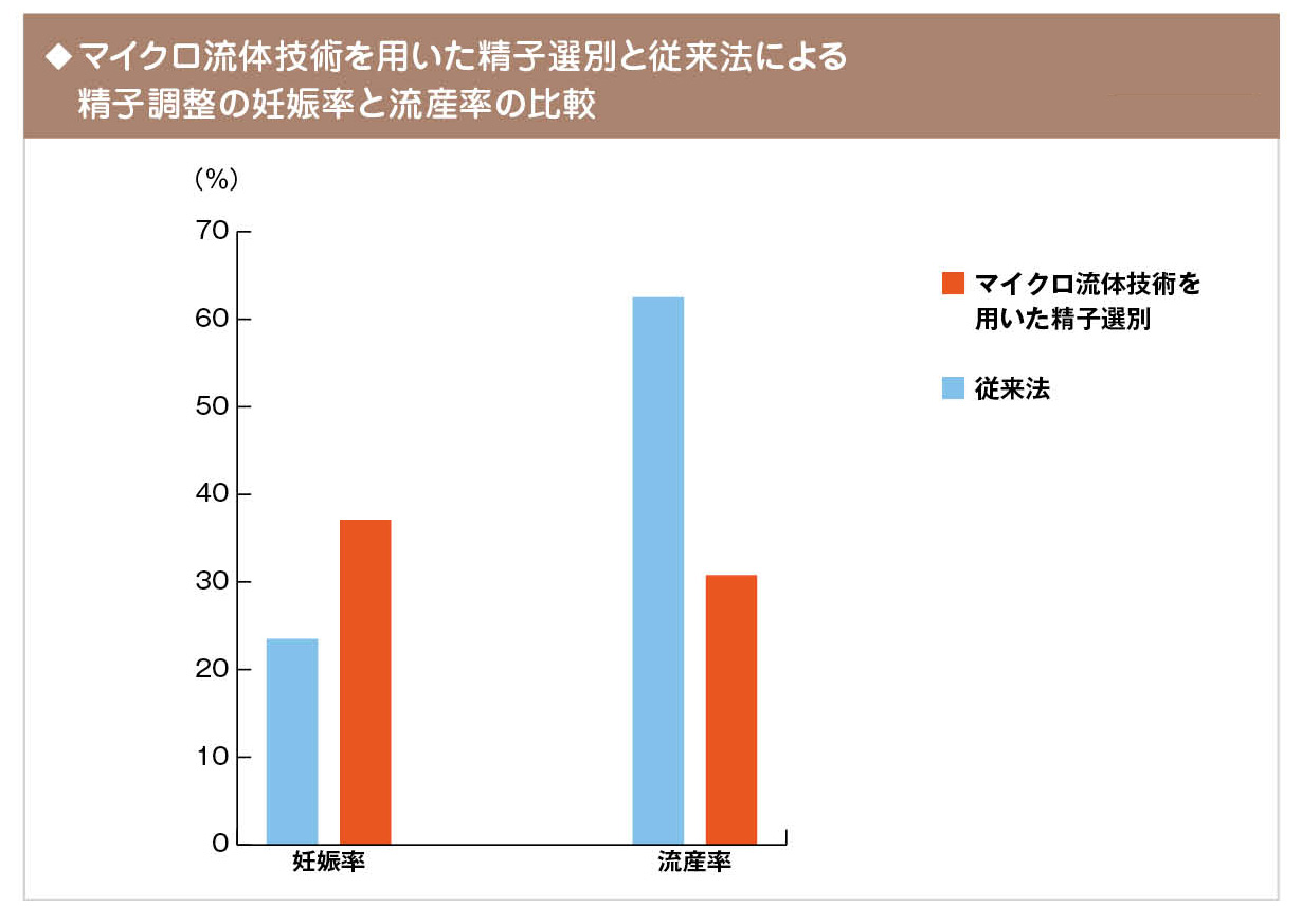 良好精子を選別できることで、従来の密度勾配遠心法(リンク挿入:)やスイムアップ法(リンク挿入:)などによる調整と比べて、妊娠率の向上や流産率の低下が期待されます。卵子や精子の質の低下が懸念される高年齢のカップルでも、同じことが期待できるという報告もあります。